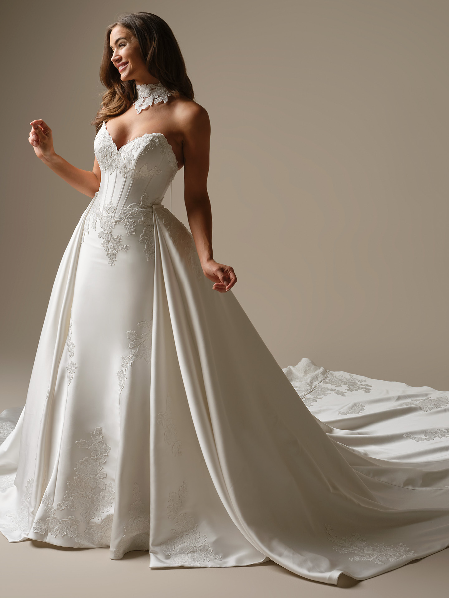 Overskirts are another fun option if you love the idea of two looks in one. These attach over your gown to add fullness, volume, or extra drama for the ceremony, then can be removed to reveal a sleeker silhouette for the reception.