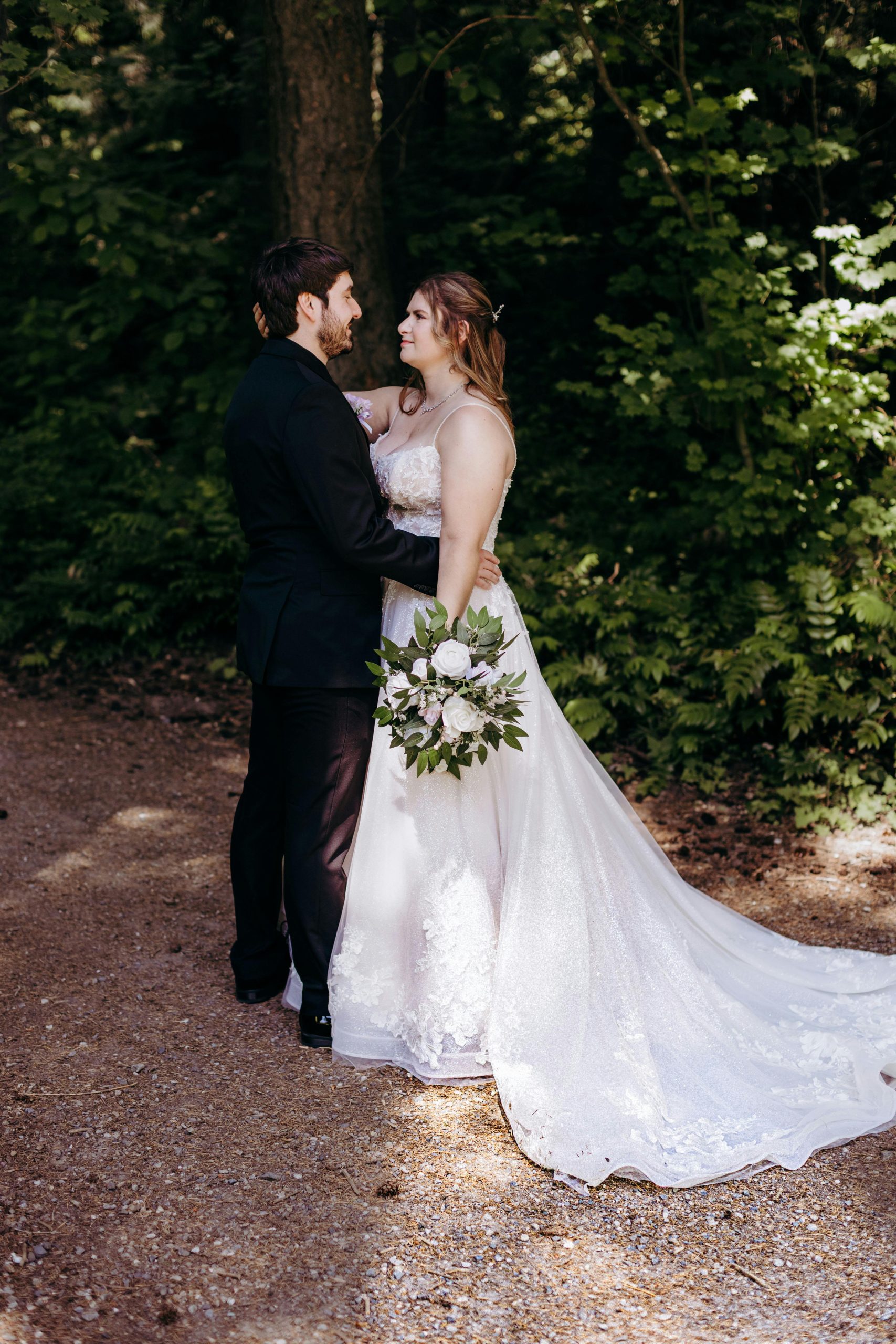 Jayna is made for the bride who wants something a little unique. With dimensional floral lace, soft shimmer, and a striking cat-eye neckline, it feels bold in an understated way. The pleated organza and basque waist create a romantic, almost couture silhouette that stands out without trying too hard. Paired with a dark, moody bouquet, this gown hits that perfect balance of dramatic and dreamy.