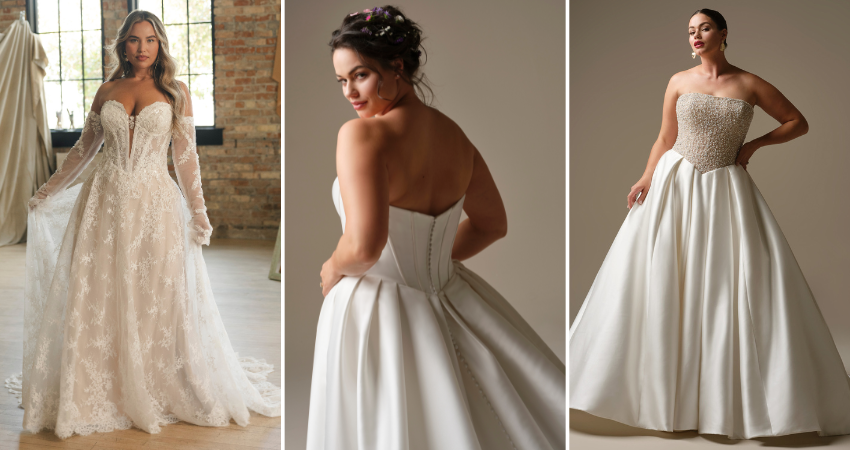 - Selena by Maggie Sottero – The crown jewel of a design could be big, could be glitzy, or could be a simple satin A-line wedding dress with pockets. All are equally commanding of respect.