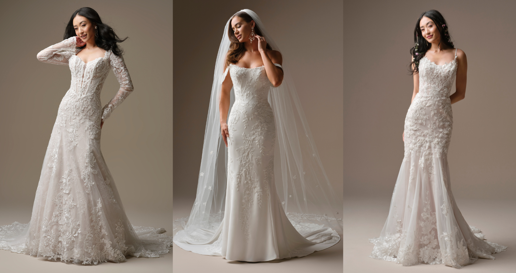 If you’re looking for a mermaid beaded wedding dress Lennon by Maggie Sottero is an excellent choice for one of our gorgeous brides-to-be! We love the formfitting silhouette of this sexy gown paired with the low neckline and off-the-shoulder cap-sleeves.