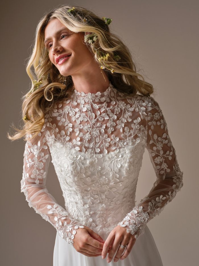 Nora is everything a garden wedding calls for, light, romantic, and a little undone. The 3-D lace and soft shimmer tulle catch the light beautifully, while the illusion plunge and side slit add just the right touch of modern allure. It feels airy and easy to move in, perfect for an outdoor celebration surrounded by florals, fresh air, and a little bit of magic.