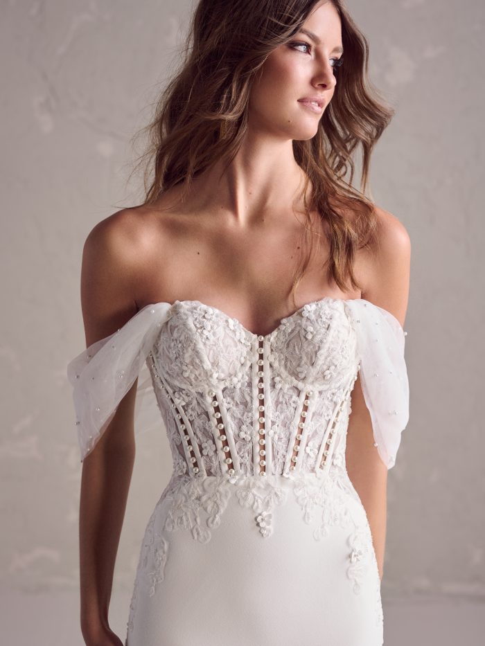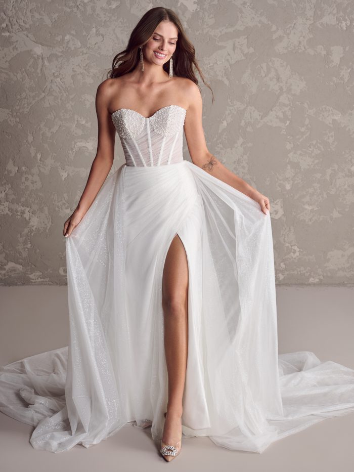 There are chandeliers, statement heels, chic champagne toppers, and over-the-top florals to make your day magical, but nothing compares to Constance, a sheath bridal gown with draped pearls and perfect shimmer.