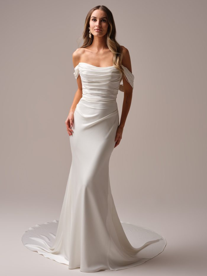 Here’s a romantic fabric for your ‘something old’ and a showstopper silhouette for your ‘something new,’ Rhoda, one satin mermaid draped pearl wedding dress to complete your perfect black-tie soiree.