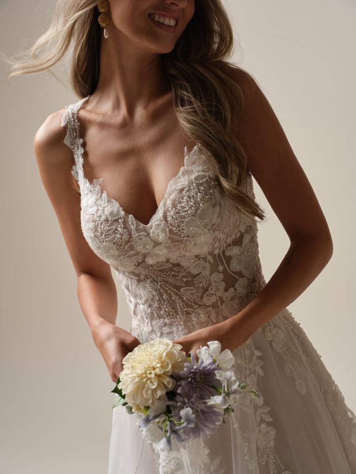 Maple is a beaded pearl V-neck A-line bridal gown designed to highlight your most stunning features with effortless elegance.