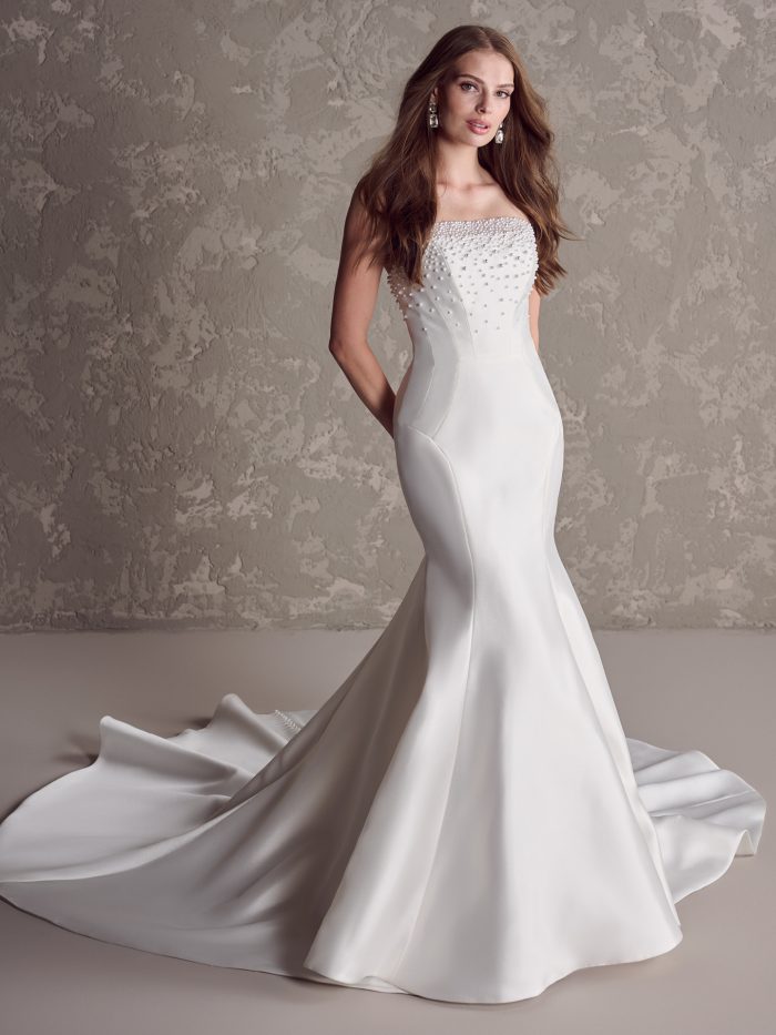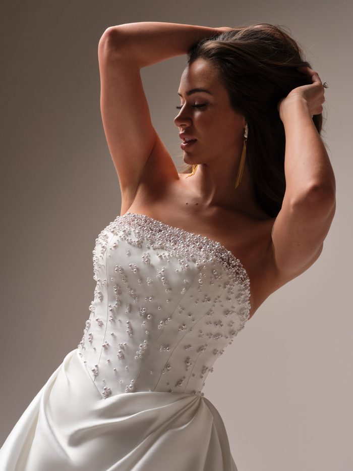 This strapless pearl bridal dress, Jasper, is 90% minimalist and 10% bedazzlement, which cross-multiplies to (checks notes) 2000% red-carpet perfection.