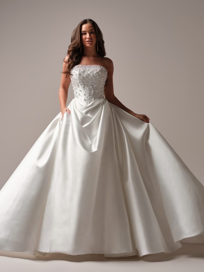 Tenille is IT. We love dramatic beauty, vintage glamour, soft elegance, and any combination thereof. Case in point? This glimmering satin A-line pearl wedding dress in a timeless silhouette and statement fabrication.