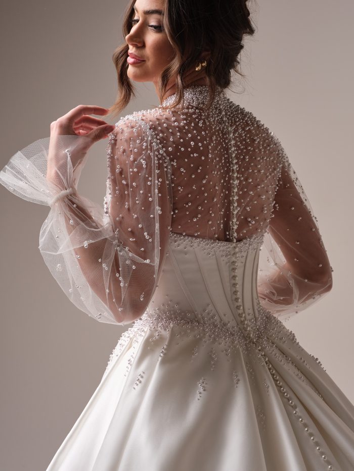 Here are some pearl wedding dresses our brides love with everything from minimalist pearl touches to full-on glam gowns: