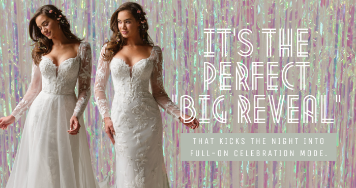 Consider how much dancing you plan to do. If you want to be on the floor all night, comfort and movement are key. Stretchy linings, shorter hems, or lighter silhouettes work well for a full night of celebrating. If you want big, joyful photo moments, look for details that pop in pictures such as shimmer, minis, or dramatic second look reveals.
