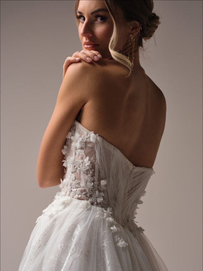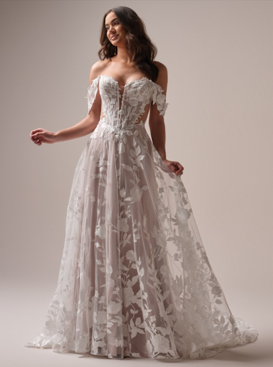 Natalie is a flattering floral A-line bridal dress with delicate illusion panels, designed to highlight your natural beauty with effortless elegance.
