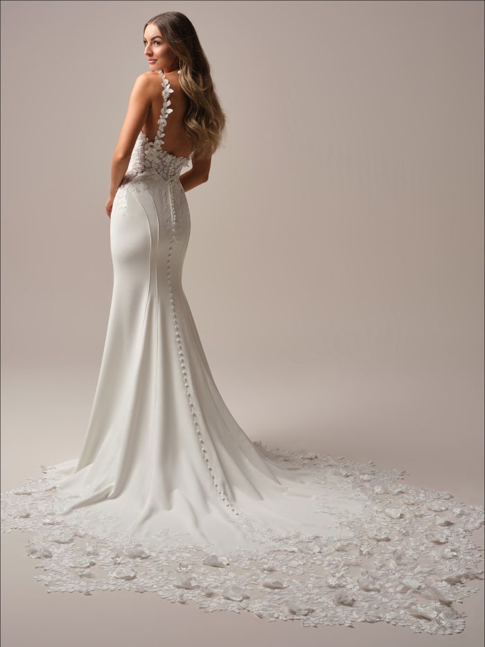 A wedding look can be many things, and sometimes you just need it to be really, really pretty in a chic and ultra-luxurious way, which is exactly where Isoline comes in. This crepe square neck floral sheath bridal dress features artful flourishes and a lovely illusion bodice that’s all about elevated elegance.