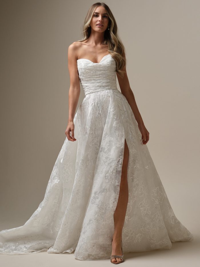 Landri is a sparkly slit A-line wedding gown inspired by all things springtime and happily-ever-after.