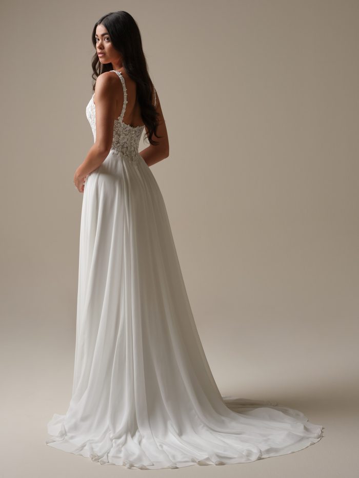 Cory is a side slit chiffon A-line wedding dress that delights in its dreamy blend of textures, shimmer, and flawless fit.