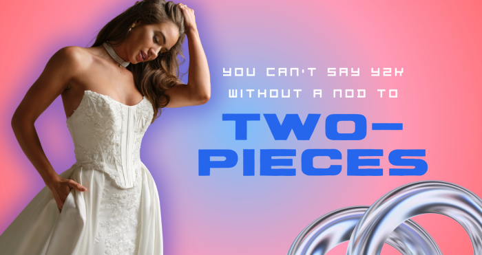 You can’t say Y2K without a nod to crop tops and corsets, two of the most ubiquitous trends from runways, red carpets, music videos, and youth culture. (Think the Charlie’s Angels reboot, Destiny’s Child at any red-carpet event, and of course, iconic concert looks from Britney Spears.) This flirty look is easy to adapt for a wedding dress like so: