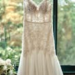 DISCONTINUED - Embroidered lace motifs accented in pearls and crystals dance over this chic boho wedding dress, featuring a sheer bodice (8MC703) or lined bodice (8MC703MC) options to fit a bride's preference. Beaded spaghetti straps glide from sweetheart neckline to illusion back embellished in lace motifs. Fit-and-flare skirt comprised of Revina Chiffon. Finished with pearl buttons and zipper closure.