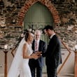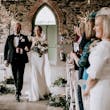 DISCONTINUED - This unique wedding dress features a bodice accented in beaded lace motifs, completing the illusion bateau neckline and straps, a sheer scoop back with crosshatch detail. Aldora Crepe fit-and-flare skirt features tulle and lace godets at the sides and back, all accented in lace motifs. Completed with an Aldora crepe belt. Finished with covered buttons and zipper closure.